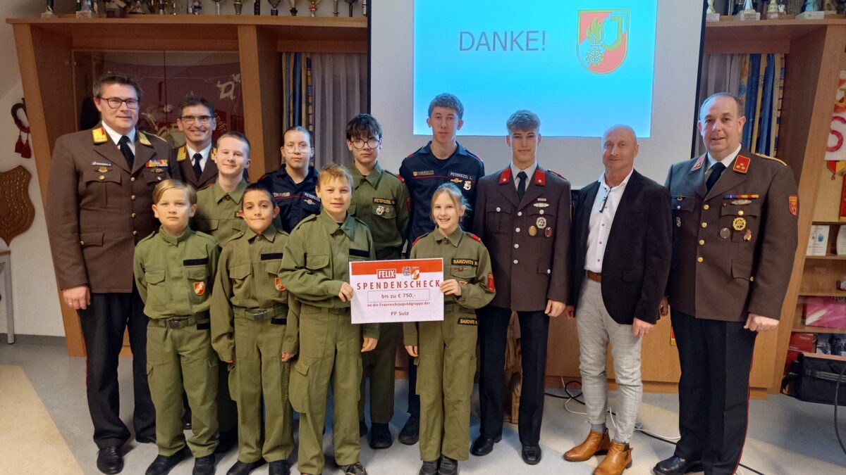 Große Freude herrschte auch über die Übergabe eines Spendenschecks der Firma FELIX Austria an unsere Feuerwehrjugendgruppe. Mit dem eingereichten Projekt konnte die Jury überzeugt werden, wodurch die erhaltenen Mittel nun gezielt in Anschaffungen für die Feuerwehrjugend investiert werden können.