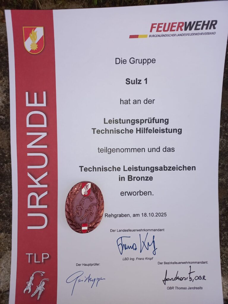 Eine Gruppe der FF Sulz hat erfolgreich an der Technischen Leistungsprüfung (TLP) in Bronze teilgenommen. Die Prüfung fand bei der FF Rehgraben statt, die für eine ausgezeichnete Organisation und eine kameradschaftliche Atmosphäre sorgte.